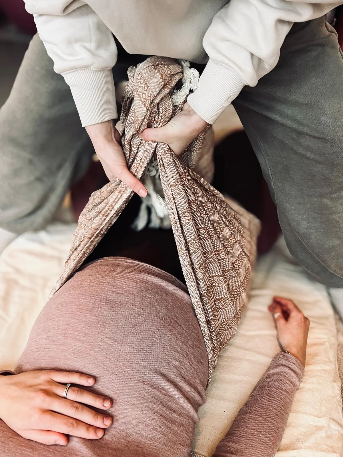 Slow Rebozo® is a nurturing embrace, a pause just for you, to honour and support your pregnancy with care and intention.